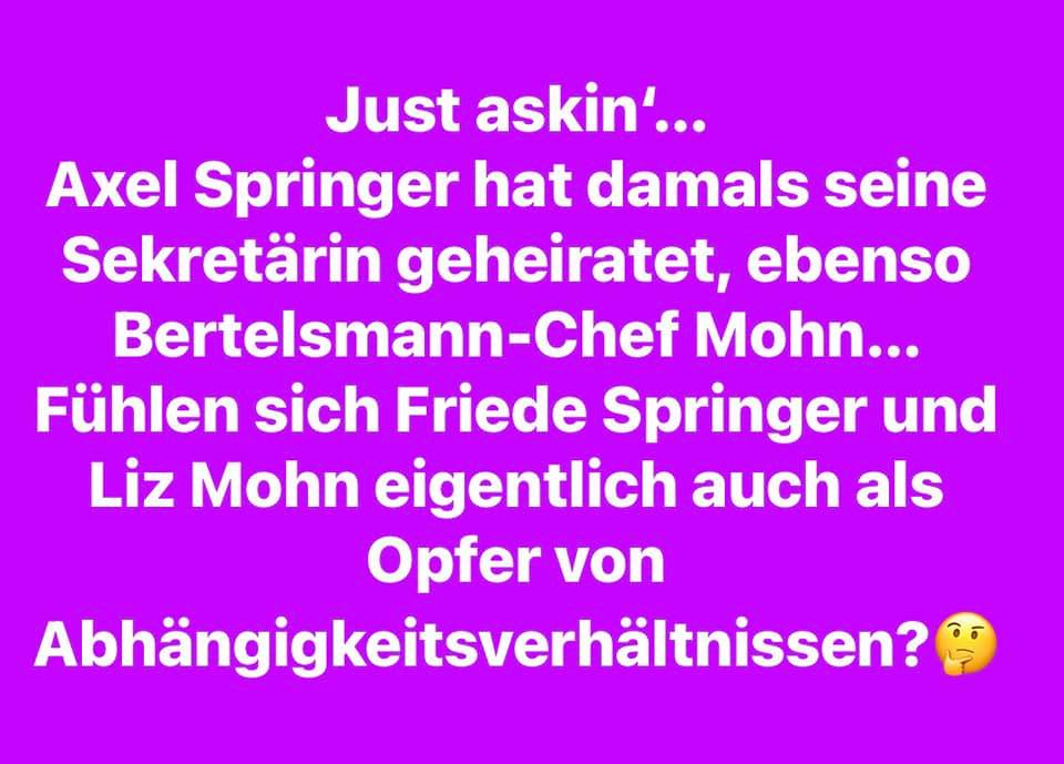 Springer, Mohn und Reichelt sind natürlich nicht gleichzusetzen, da sich nur einer nach unten geschlafen hat. Aber was relativiert man nicht alles. Auch Friede Springer beschwerte sich schon über die Kampagnen des inzwischen sehr schweigsamen Herrn Reichelt.