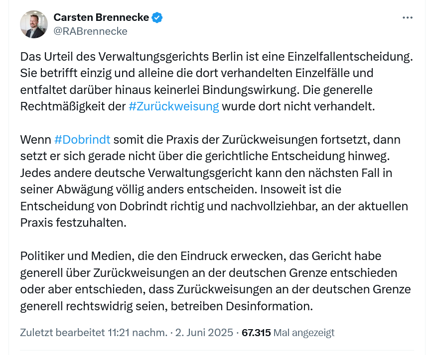 Screenshot 2025-06-03 at 16-24-10 Carsten Brennecke auf X „Das Urteil des Verwaltungsgerichts Berlin ist eine Einzelfallentscheidung. Sie betrifft einzig und alleine die dort verhandelten Einzelfälle und entfaltet darüber hin[...].png