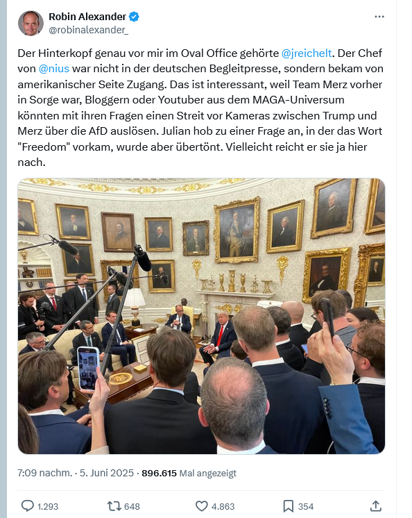 Screenshot 2025-06-08 at 12-25-53 Robin Alexander auf X „Der Hinterkopf genau vor mir im Oval Office gehörte @jreichelt. Der Chef von @nius war nicht in der deutschen Begleitpresse sondern bekam von amerikanischer Seite Zugan[...].png