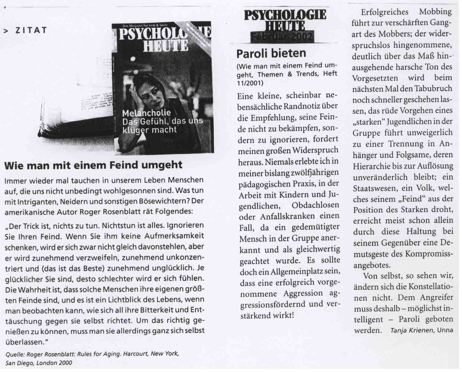 Wie verhält man sich bei einer Aggression? Ende 2001 schrieb ich an die „Psychologie Heute“ dies –