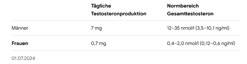 Frauen produzieren auch Testosteron. Wie aus der Tabelle ersichtlich etwa nur ein Zehntel von dem eines Mannes.