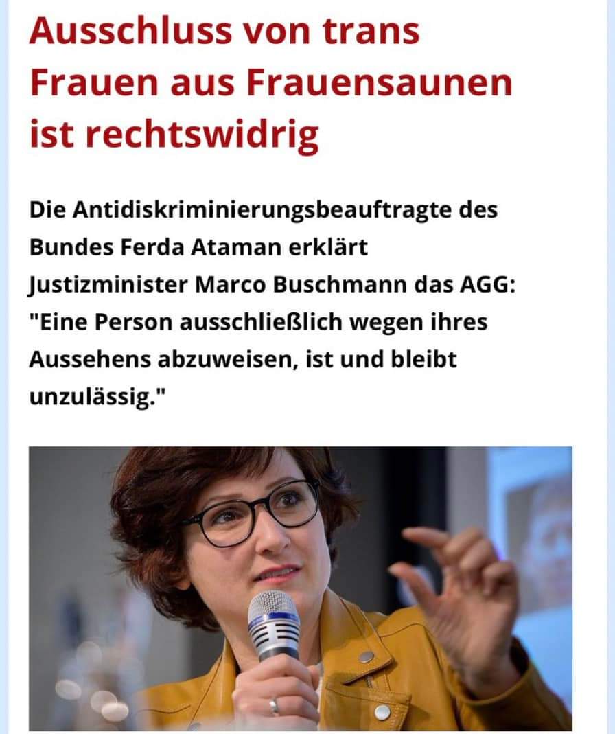 Ferda Atman stuft diese Regelung jedoch als unzulässig ein. Sie erklärt gegenüber der Süddeutschen Zeitung: „Pauschale Ausschlüsse von Menschen wegen ihrer geschlechtlichen Identität, ob im Job, auf dem Wohnungsmarkt oder in der Sauna, darf es auch in Zukunft nicht geben.“