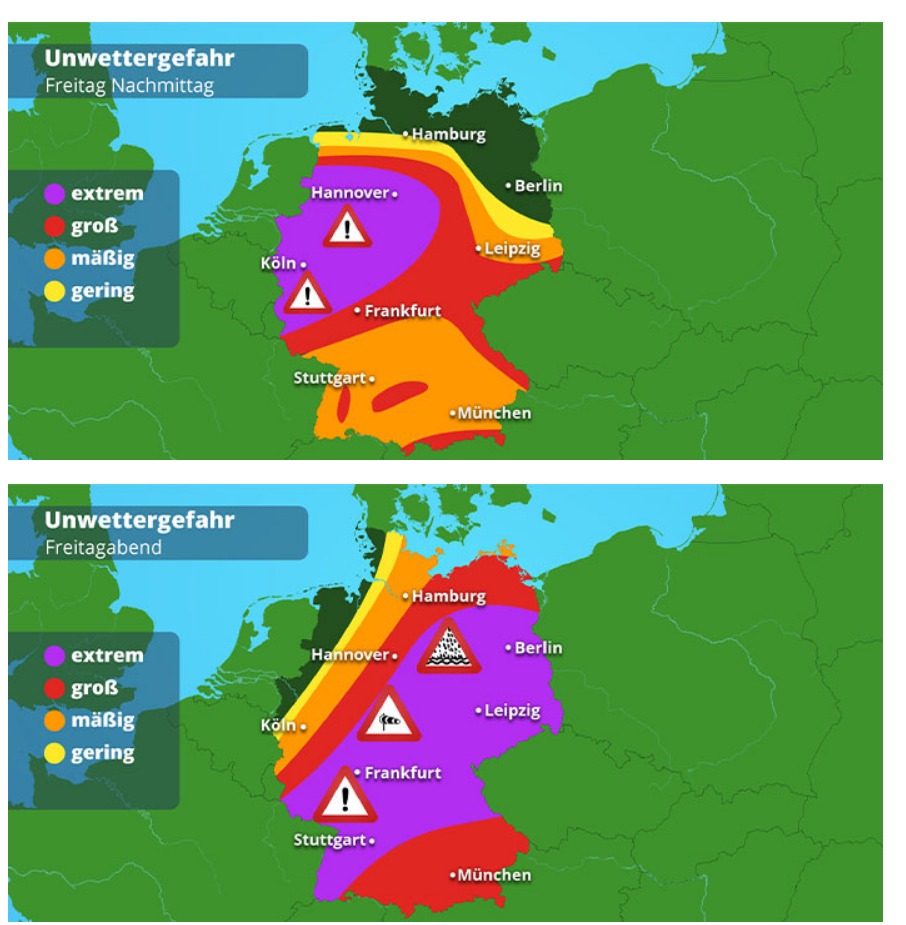 Eine ungewöhnliche Unwetterlage begünstigt in Deutschland die Bildung von Superzellen und womöglich auch Tornados. Los geht es bereits am Donnerstagnachmittag (19.05.2022), die höchste Warnstufe gilt aber hauptsächlich für mehrere Bundesländern am Freitag (20.05.2022). Es drohen massive Schäden durch Blitzschlag, Orkanböen, größeren Hagel und heftigen Starkregen!