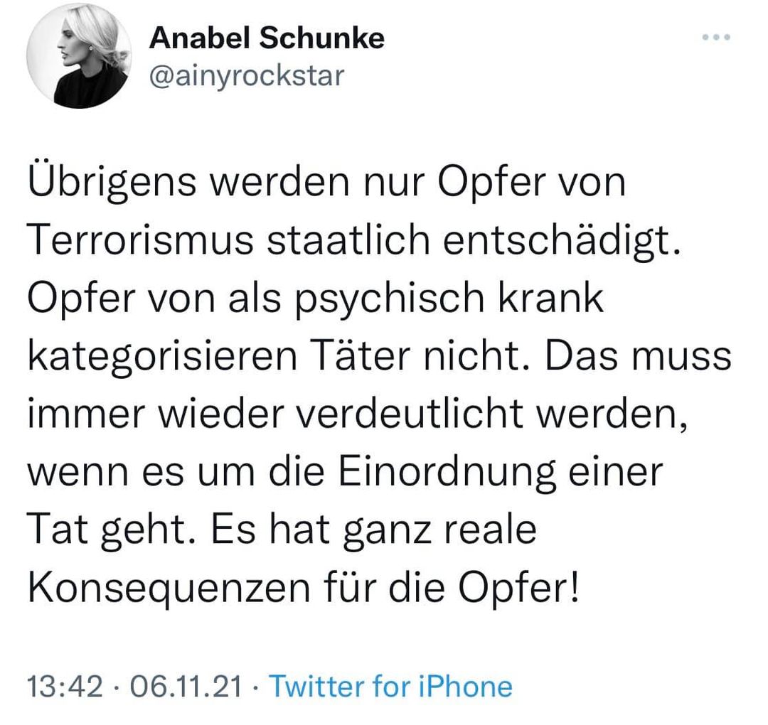 Außerdem - wenn der Täter zuvor nicht durch Schizophrenie aufgefallen ist, geht mir die Einschätzung, er sei psychisch gestört, viel zu schnell. Denn das stand am nächsten Tag schon fest, obwohl er vor der blutigen Tat nicht psychisch gestört, sondern "nur" durch ein anderes kriminelles Delikt aufgefallen war.