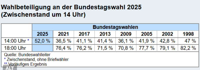 Die Beteiligung habe in den Wahllokalen bis 14 Uhr bei 52 Prozent gelegen, teilte die Bundeswahlleiterin mit. Bei der vergangenen Bundestagswahl im September 2021 waren es 36,5 Prozent gewesen.