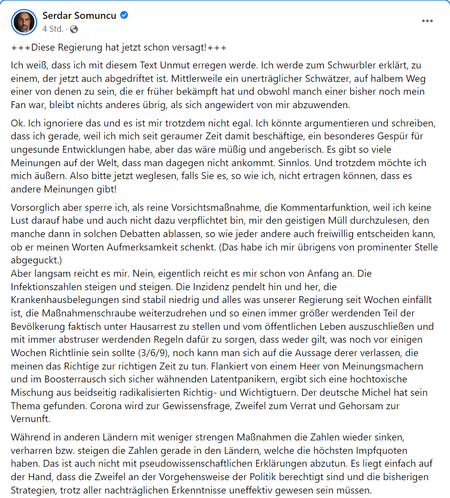 Der deutsch-türkische Kabarettist Serdar Somuncu (unter anderem Radio Eins) wurde nach eigener Aussage letzte Woche bei Facebook mit einem sogenannten Shadowban belegt, so dass die Reichweite seiner Beiträge bis auf Weiteres drastisch eingeschränkt sei. Grund ist wohl ein längerer Post Somuncus mit der Überschrift „+++Diese Regierung hat jetzt schon versagt!+++“, in dem er sich an der deutschen Corona-Politik und ihren Protagonisten wie Karl Lauterbach (SPD) abarbeitet (in voller Länge nachzulesen hier).