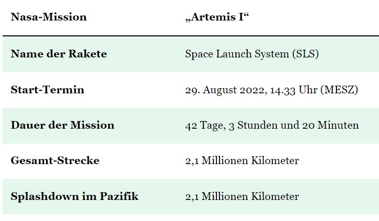 Das Raumschiff „Orion“ startet unbemannt wird nur am Mond vorbeifliegen. Diese Mission ist der Auftakt des Raumfahrtprogramms „Artemis II“ (geplant 2024) und erst dann sollen Astronautinnen und Astronauten um den Mond herum befördert werden.